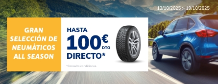 Condiciones promoción: Oferta válida del 13 al 19 de octubre de 2025. Hasta 100€ de descuento en neumáticos All Season BFGOODRICH, PIRELLI, BRIDGESTONE, KUMHO, CONTINENTAL, YOKOHAMA, NEXEN ,GENERAL TIRE, UNIROYAL, COOPER , NORAUTO , DUNLOP , FIRESTONE, HEADWAY, LEONARD, NANKANG, TRACMAX y LANVIGATOR.